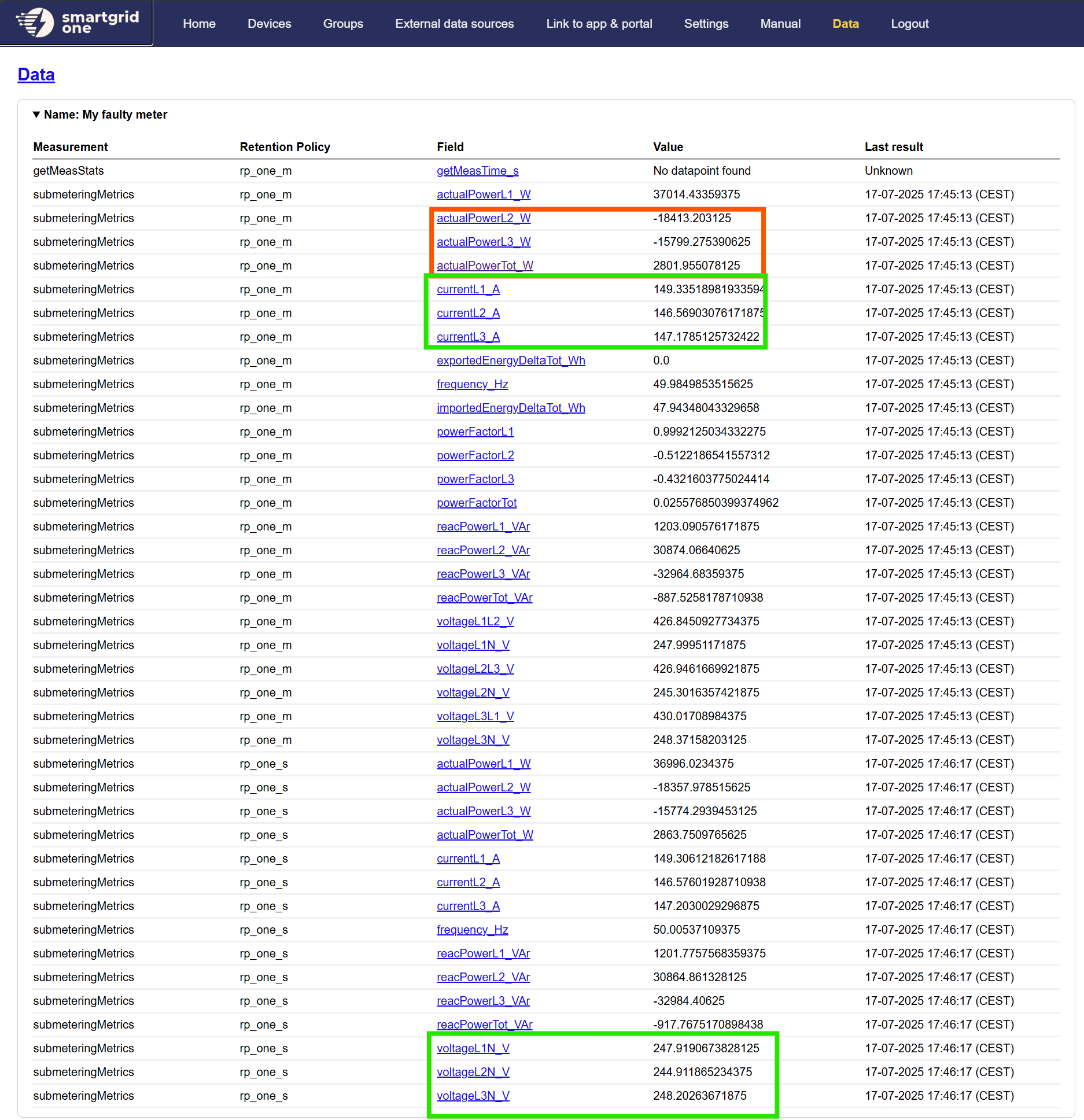 What we see instead, is that the consumption is 118 kW, which is not possible. The first step is to check the raw data in the SmartgridOne Controller. This can be done by going to the commissioning interface, and then to the Data tab. We immediately notice the following on our grid meter: