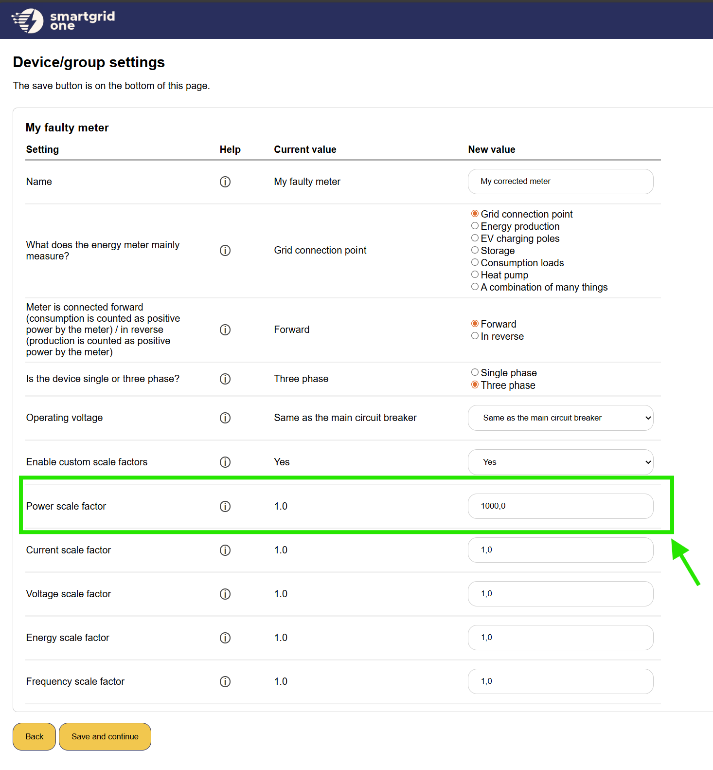 For the SmartgridOne Controller energy meters are pre-configured with the most common scaling factors. However, if you have a different scaling factor, you can rescale the energy meter readings.