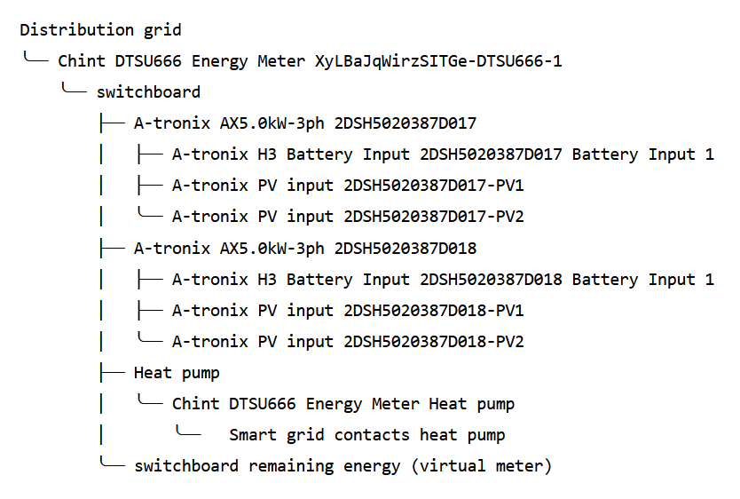 Only one item may appear at the top level (i.e., just below “distribution grid” of the installation), and it must be the energy meter of the grid, a group or a solar installation.