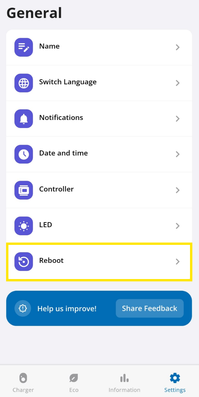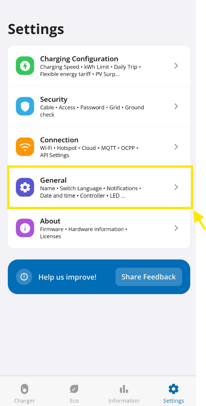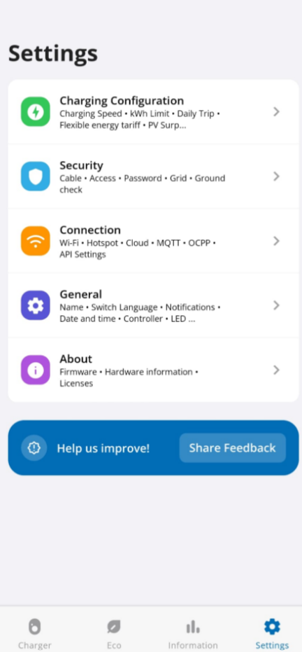 In the go-e application, go to your device, then "Settings".