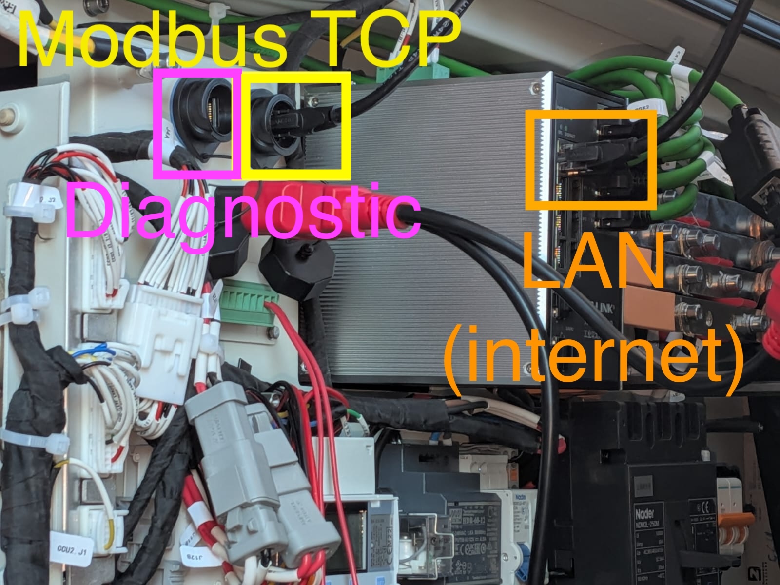 - Yellow: The interface for Modbus TCP. This cable can be connected to a network switch that is in the same subnet as the SmartgridOne Controller.a