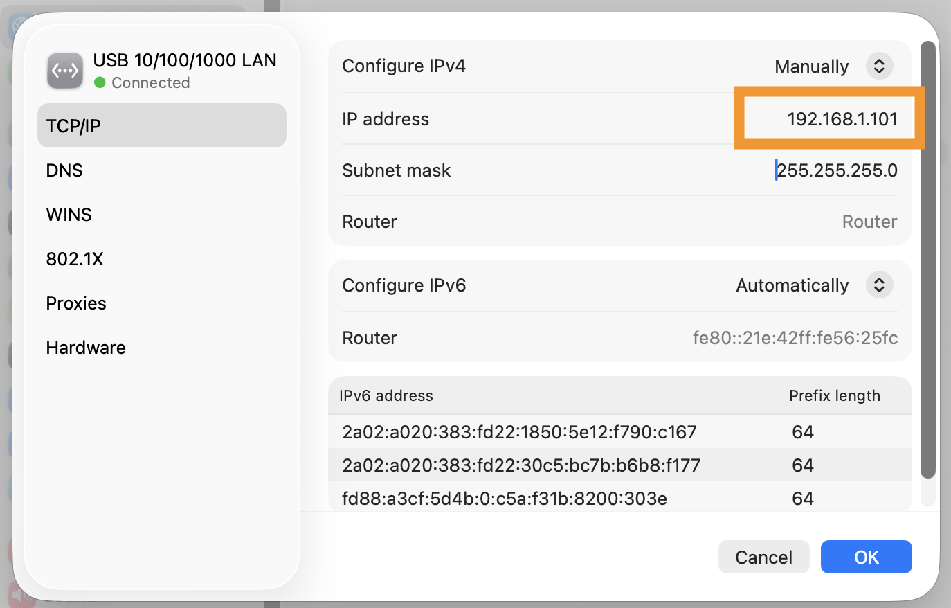 Step 4: Open the network settings on you computer, and manually assign IP address 192.168.1.101: