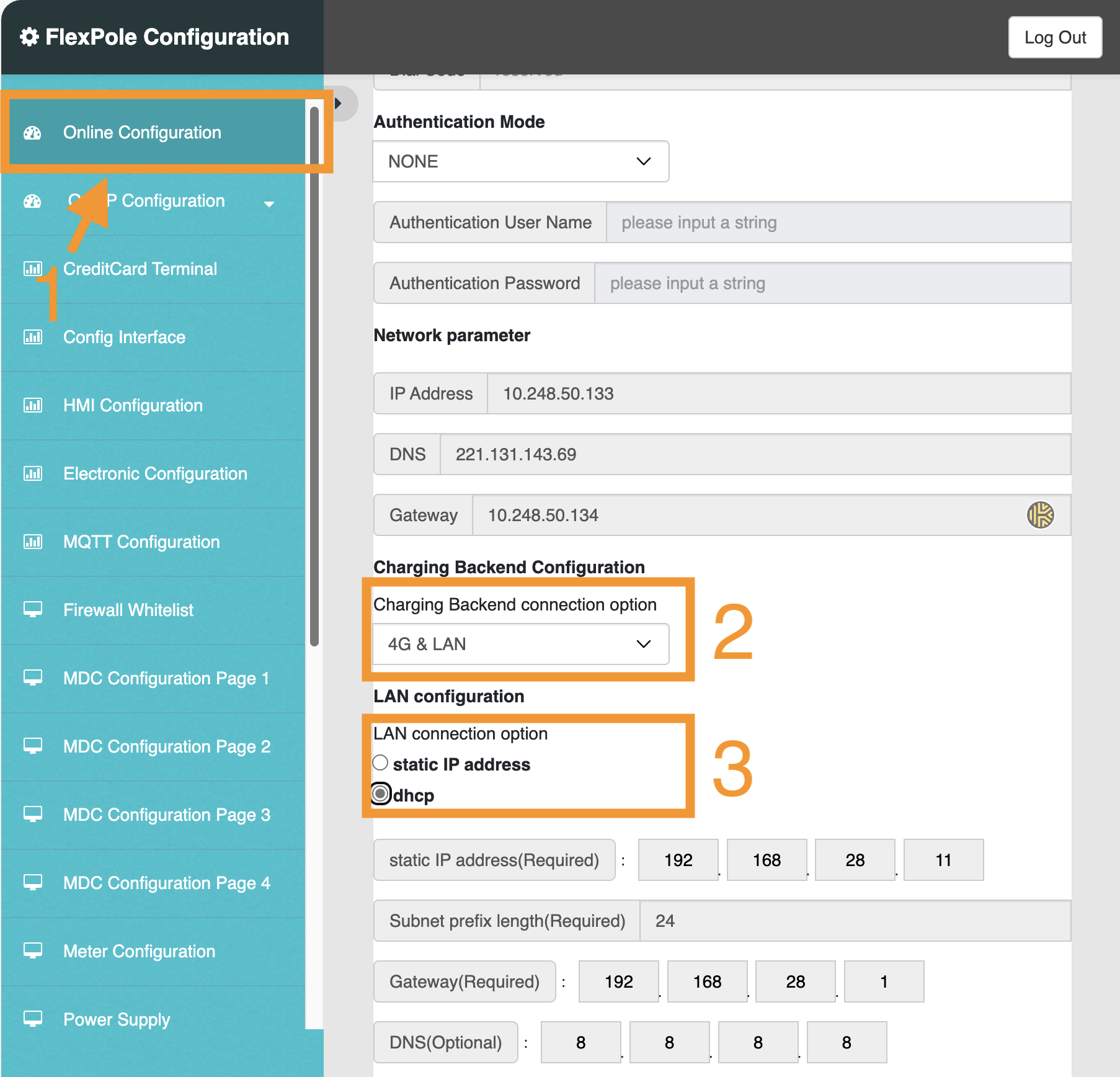 Step 6: In the sidebar, select 'Online configuration', and scroll down on the page. Adjust your settings to the marked areas in the image below: