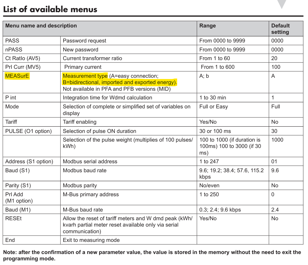 You can set this in the ‘MEASurE’ configuration menu on the energy meter. This should be set to ‘b’.