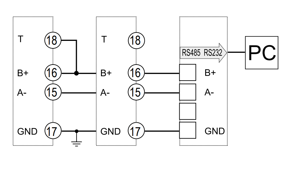| Terminal 16 / B+ | RS485 B | RS485_NEG | RS485 B | TX- |