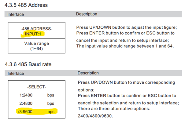 - You MUST give each device on the RS485 bus a unique address. Check the manual of the device on how to do this.