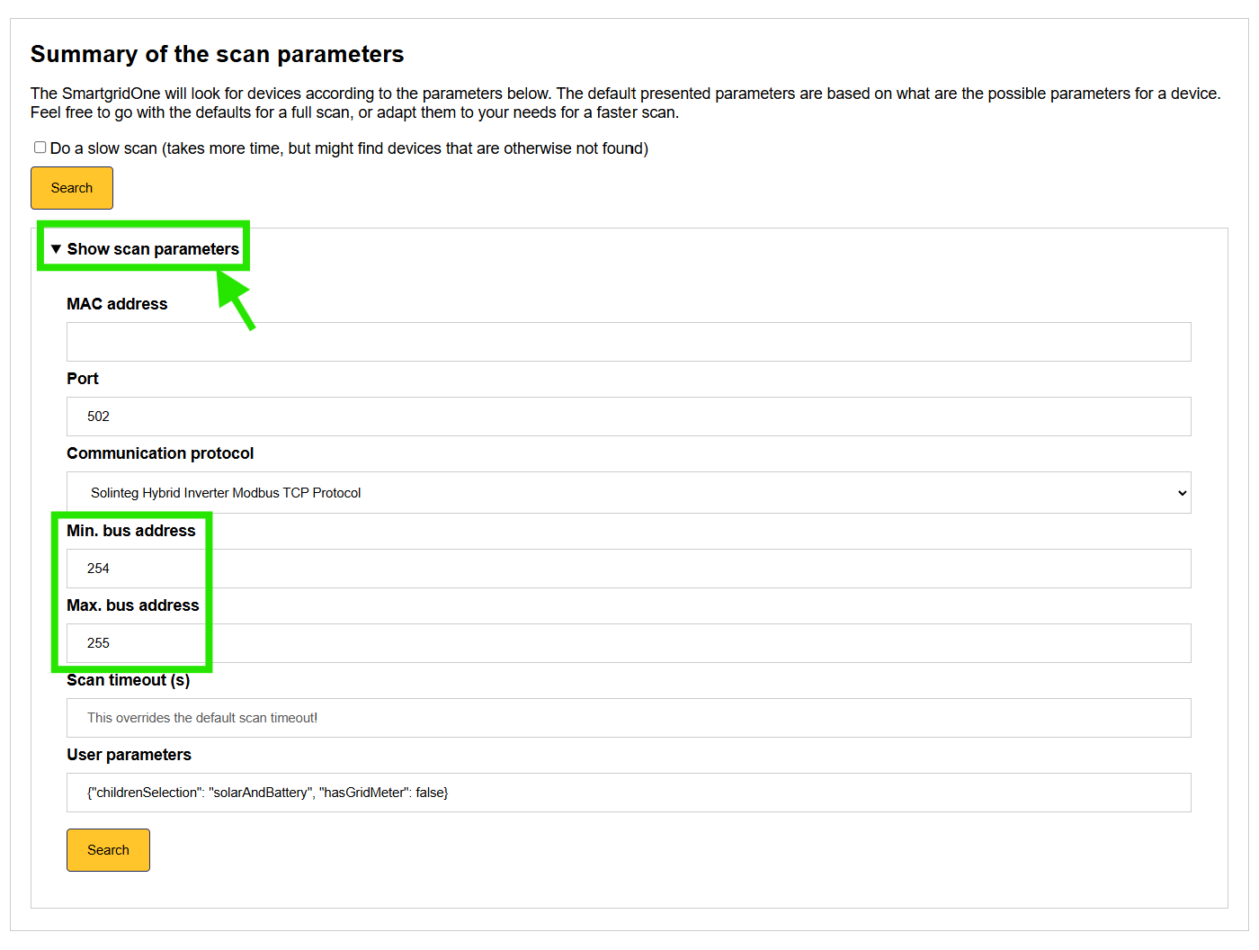 The Solinteg default bus addresses are 247 for Modbus RTU and 255 for Modbus TCP. The SmartgridOne Controller will scan for devices on all addresses from 1 to 255. Therefore, it can take a while to scan for devices.
