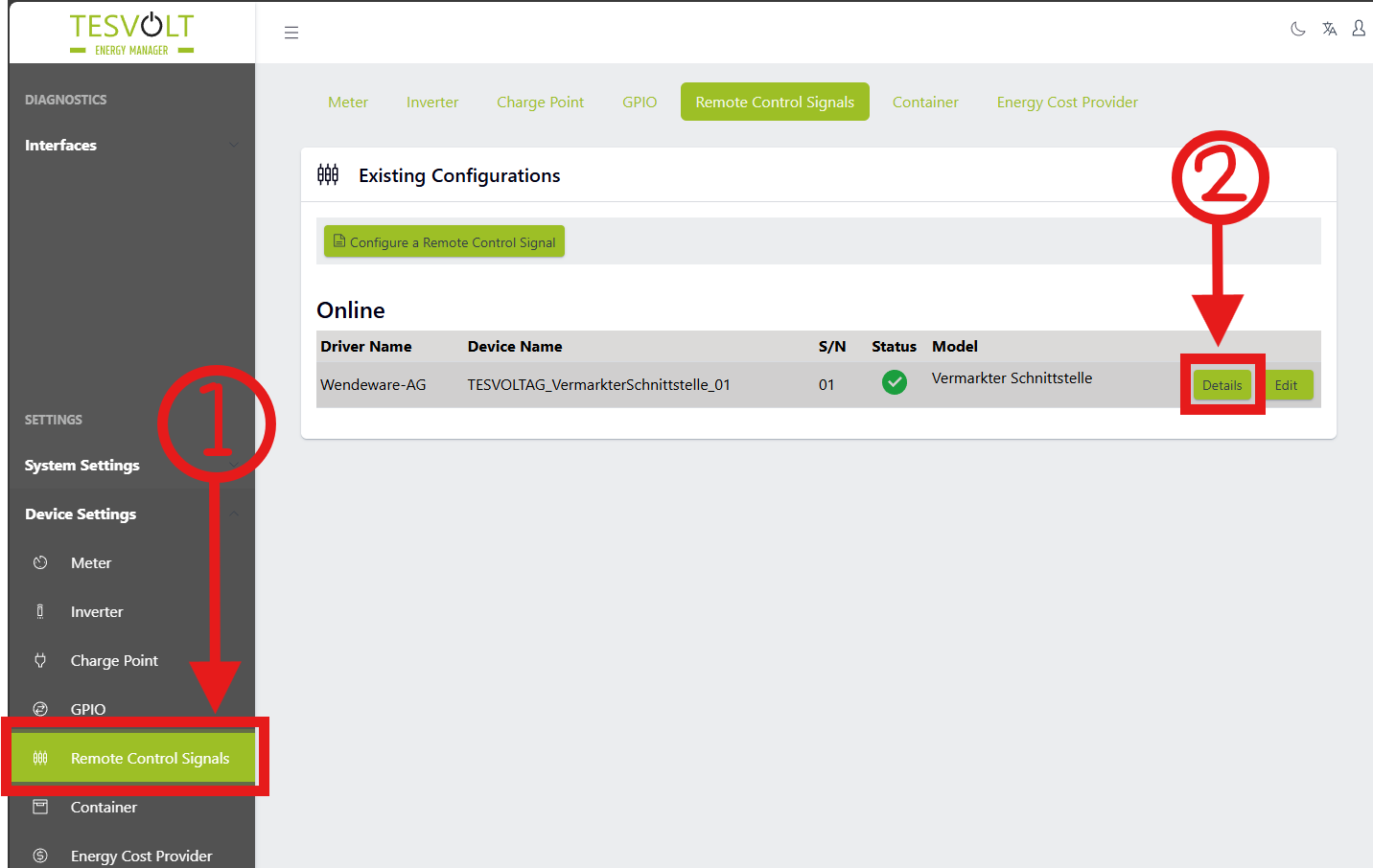 Inside the Tesvolt Energy manager web interface, it's possible to check the signals that are sent by the SmartgridOne Controller to the Tesvolt Energy Manager. It can be reached using this way: