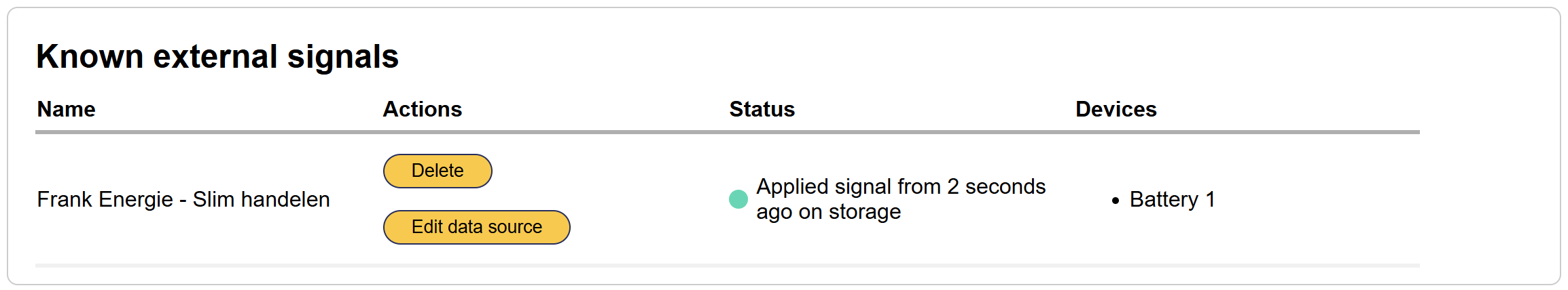 If your battery has been removed due to unresponsiveness, please check the communication of your SmartgridOneController and battery, and re-add the 'Frank Energie - Slim Handelen' external signal to the SmartgridOneController once the issue is resolved.