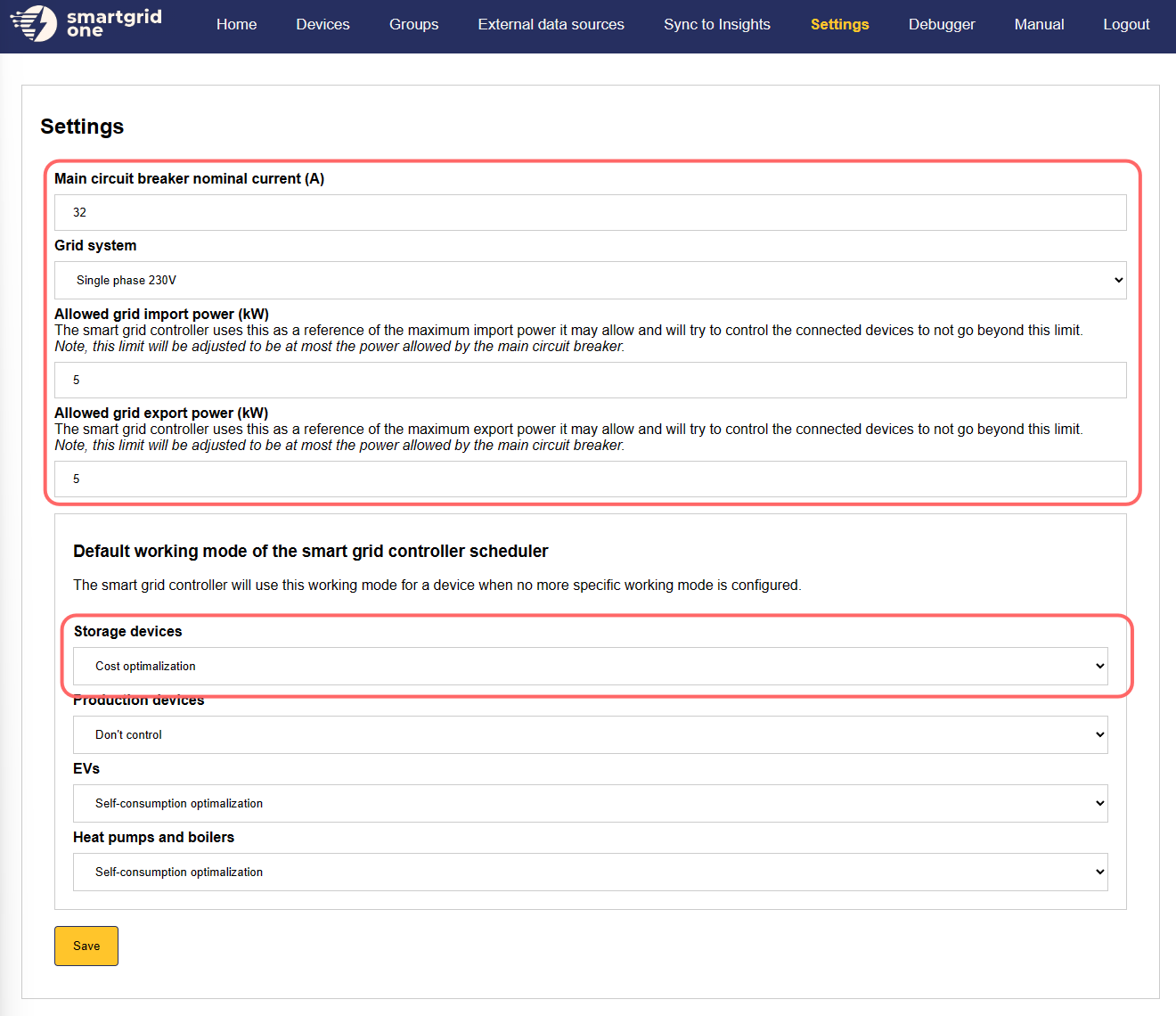 Software version 1.18.0.3 or older: In this modus, Yuso asks the SmartgridOne Controller to steer 'self-supply' on the meter. The SmartgridOne Controller follow the mode configured as default mode (e.g. "Self-consumption") in the SmartgridOne Controller, which can be configured in the settings of the controller.