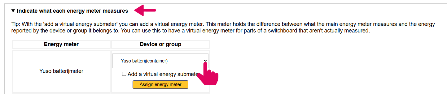 Some batteries don't give the energy and power values on the AC-side of the inverter. This can be a potential loss in revenue during negative imbalance moments. We provide a simple solution in which a dedicated meter can be assigned to a battery. Instead of reading out the battery power, we read out the power of the dedicated meter.