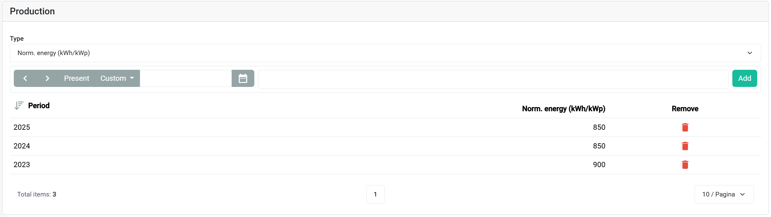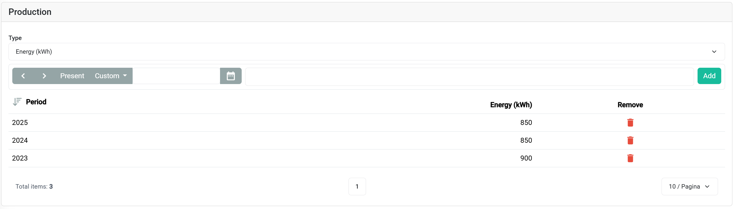 - For each period (month, quarter, year, etc.), enter the expected production in kWh.